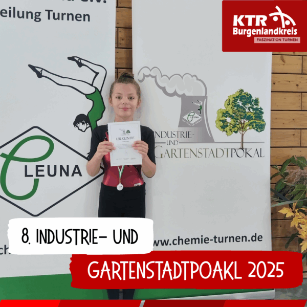 Am 13. September 2025 nahm Frieda Wolf für die KunstTurnRegion Burgenlandkreis am 8. Industrie- und Gartenstadtpokal in Leuna teil – ihr erster Wettkampf im Pflichtprogramm P3! Mit viel Nervosität, aber auch großer Freude zeigte Frieda schöne Übungen an allen vier Geräten und absolvierte einen gelungenen Einstieg in die neue Wettkampfklasse. Wir sind sehr stolz auf Frieda und ihren sportlichen Ehrgeiz. Ein gelungener Start. Ein herzliches Dankeschön geht an Chemie Leuna e. V. für die liebevolle Organisation dieses Wettkampfs. Die tolle Atmosphäre und das Engagement des Ausrichters haben diesen Tag für alle Beteiligten zu einem besonderen Erlebnis gemacht.